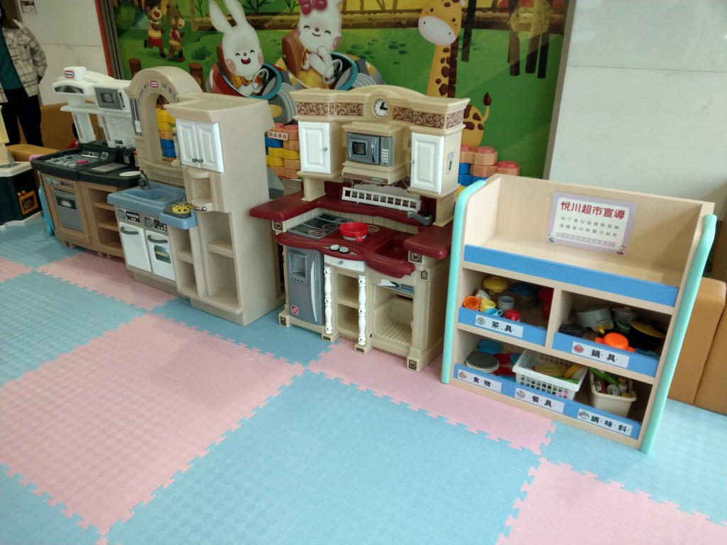 宜蘭悅川酒店的親子館從入口右方至左方大致分成幼兒區、DIY區、滑梯球池區(2~12歲才可進入)、家家酒體驗區、積木區、滑車區及最裡面的大人遊戲區