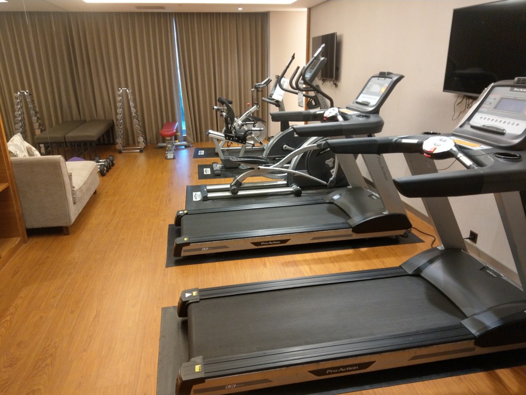 吃完晚餐休息一下後需要還點熱量債的話可以換上運動服裝前往5F的柏拉圖健身房,面積不大算精巧型健身房,入口備有水跟毛巾相當貼心阿!