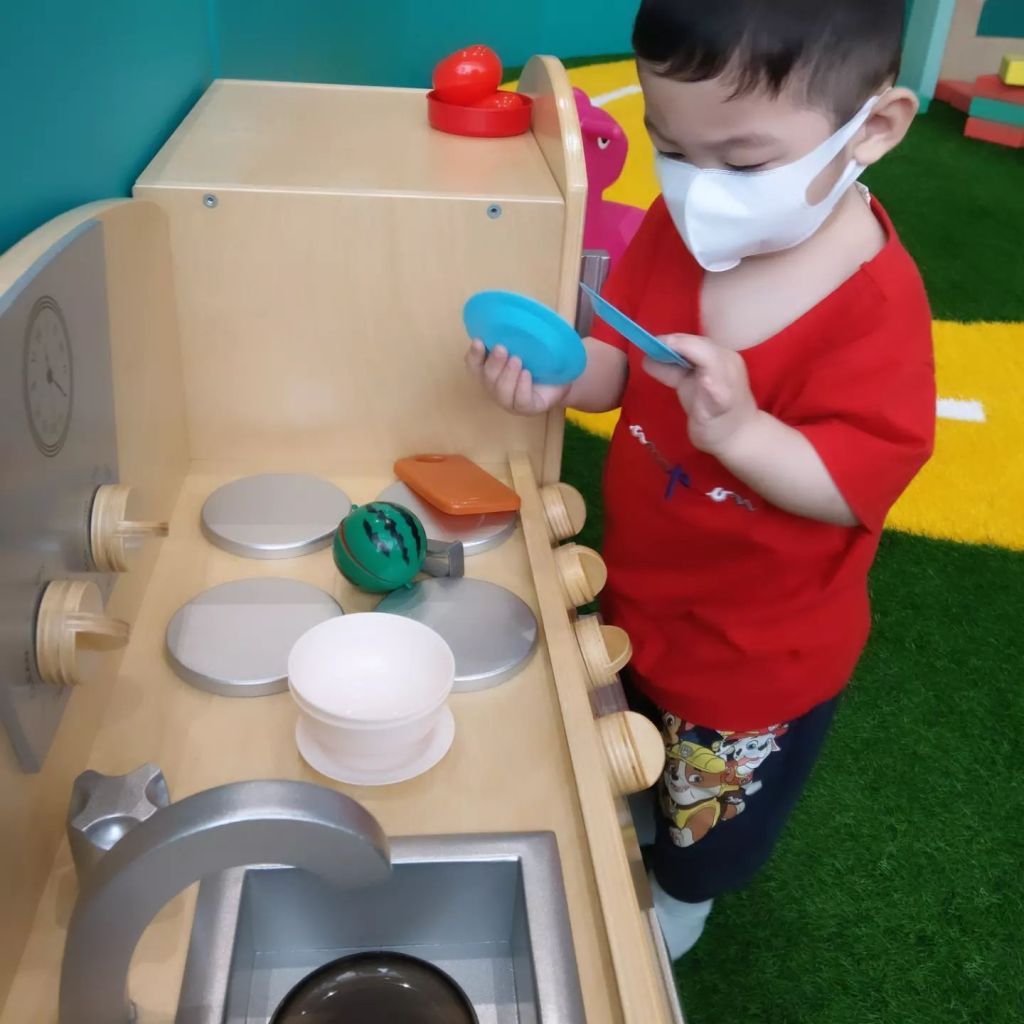 有球池溜滑梯、軟積木、滑步車、搖搖馬、家家酒及木頭組合區